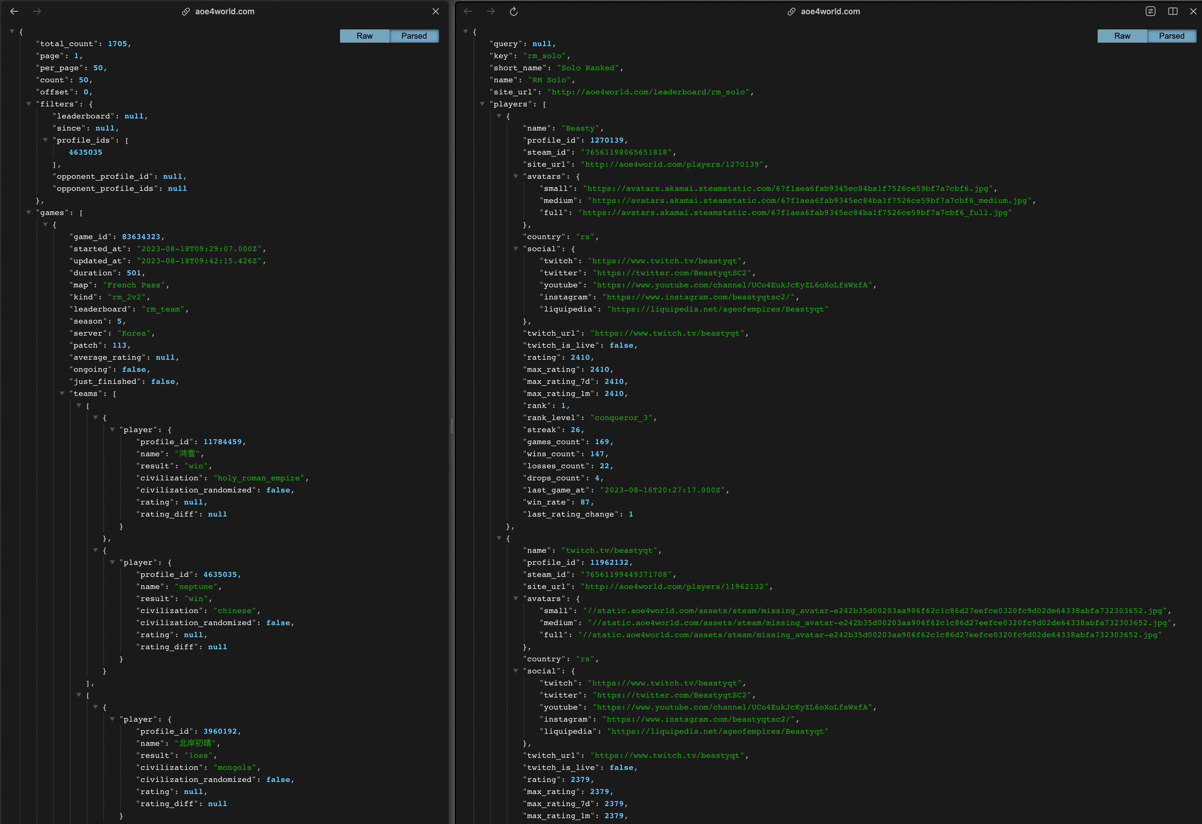 The AoE4 World API is a community-driven project to provide a free and open API for Age of Empires IV. Developers can use this API to build tools and services for the game, such as leaderboards, overlays, and more. The API provides leaderboards, player profiles, match history, and more.
