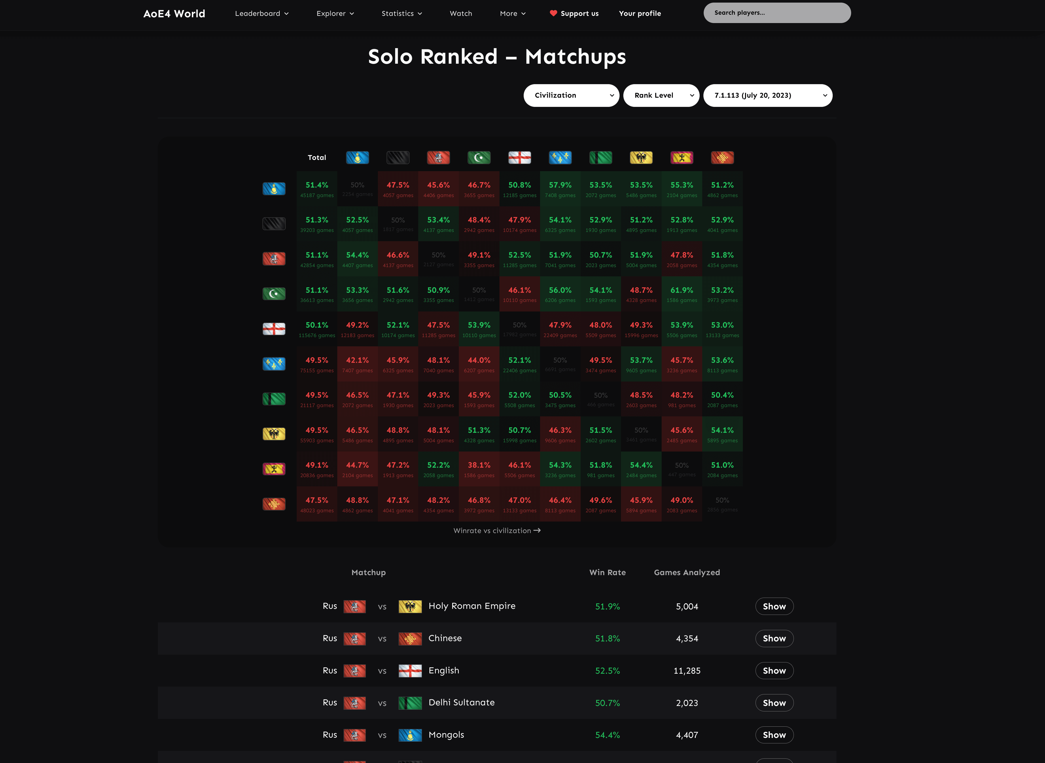 A detailed, per patch, breakdown of win rates for all civilizations in Age of Empires IV.